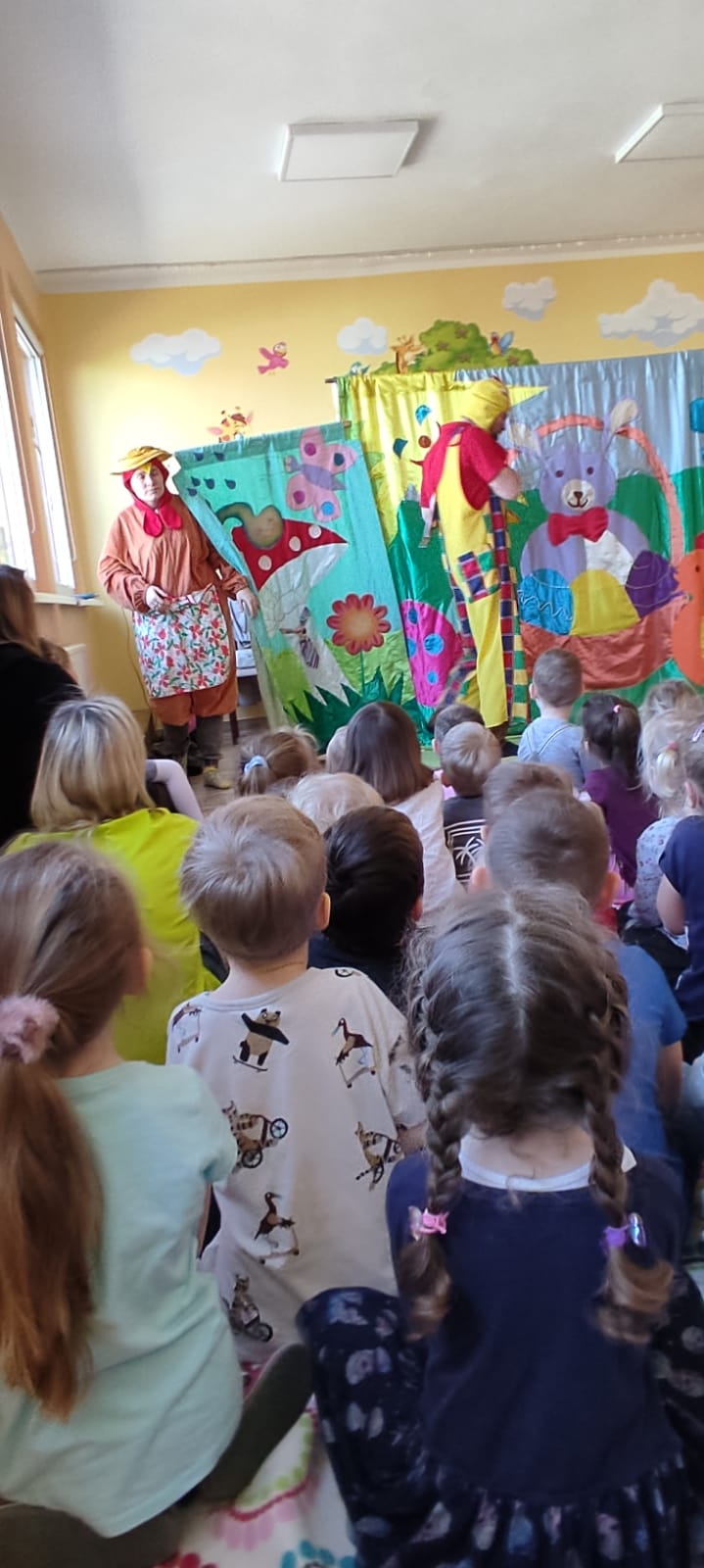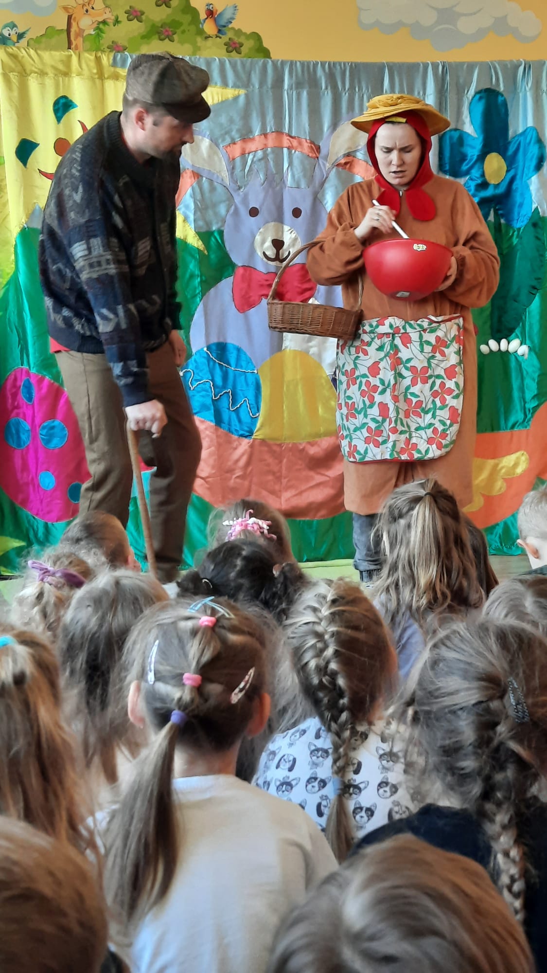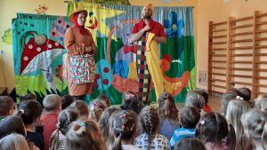 Dnia 25.03.2022r w naszym przedszkolu gościliśmy teatr Magik z Białegostoku, który w związku ze zbliżającymi się Świętami Wielkanocny zaprezentowali naszym przedszkolakom spektakl pt. “Zagubione pisanki”. Dzieciom bardzo się podobała przedstawiona forma teatralna. Poniżej przedstawiamy fotorelację z występu 🙂