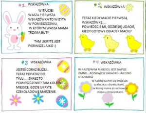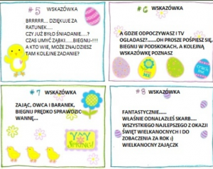 Do tej zabawy warto się przygotować zawczasu- pochowaj w różnych miejscach domu (ogrodu) czekoladowe jajeczka (możesz je zastąpić papierowymi, plastikowymi lub prawdziwymi pisankami). Dla każdego uczestnika przygotuj również koszyczek (może być pudełko) do zbierania jaj. Do dzieła- ruszajcie by znaleźć ukryte skarby!
